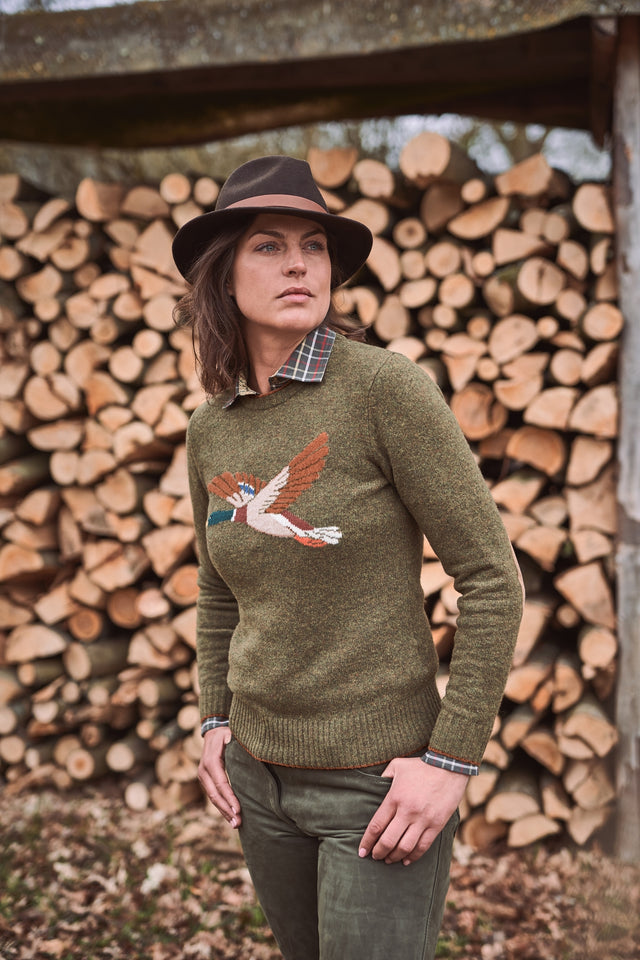 Meget højkvalitetsstrik i udsøgt lammeuldskvalitet. Vaskbare kanter af gede-ruskind på albuerne. Tidløst smukt gråandemotiv på forsiden. Kontrastfarvede manchetter på krave og ærmeender.