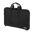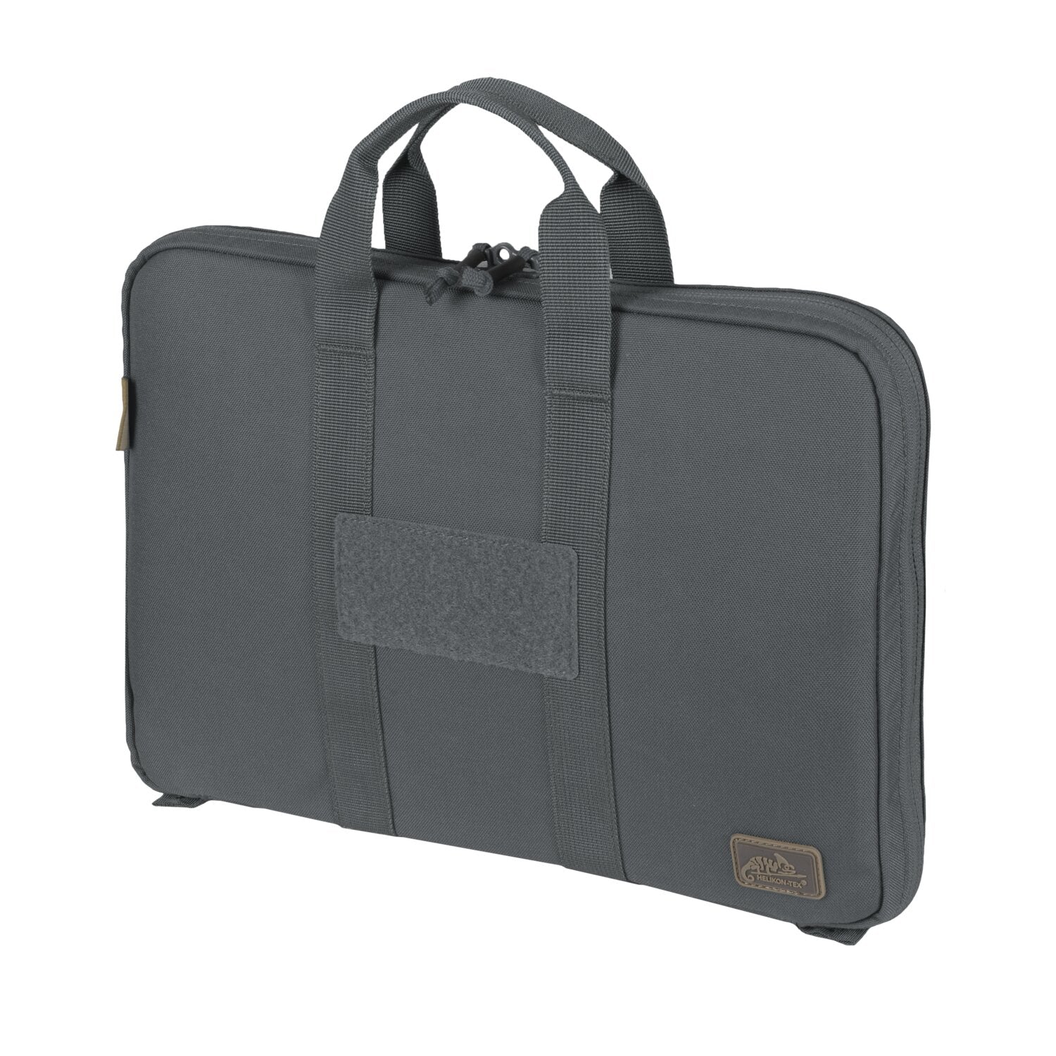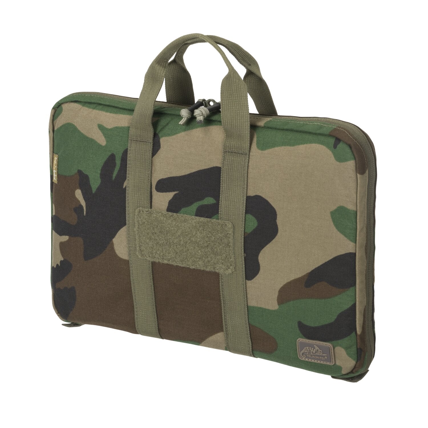 Double Pistol Wallet beskytter effektivt korte pistoler og revolvere. Den ene side har ud over to pistolholdere også tre ekstra magasinpladser. Et indvendigt krog- og løkkepanel gør det muligt at fastgøre kompatible indsatser. På den anden side af den taktiske våbentaske er der en flad lomme, der lukkes med en velcrolukning og er udstyret med en gummiorganisator med fem rum. Materialet er lavet af en afbalanceret blanding af nylon og polyester, hvilket gør militærkufferten ekstremt let og overordentlig holdbar. Produktet er forstærket med et bånd, der også fungerer som et bærbart håndtag.