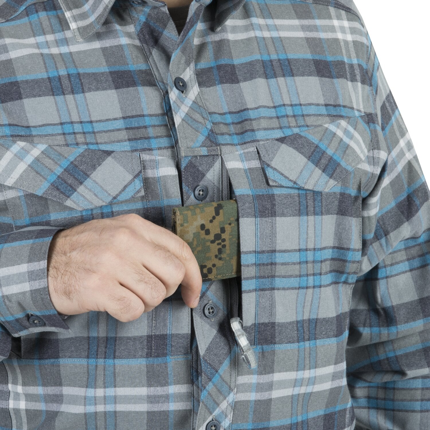 Denne alsidige skjorte har en afslappet pasform, der er perfekt til udendørs aktiviteter og taktisk brug. Den lukkes med solide knapper, der er diskret præget med Helikon-Tex-logoet. Skjorten har fire strategisk placerede lommer: to hovedlommer med velcrolukning og to ekstra Napoleon-lommer med YKK®-lynlåse, som øger sikkerheden for de ting, man har med sig. Derudover er der en løkke til at hænge briller på knapstolpen og en lille forstærkning under kraven for at forhindre, at den ruller.