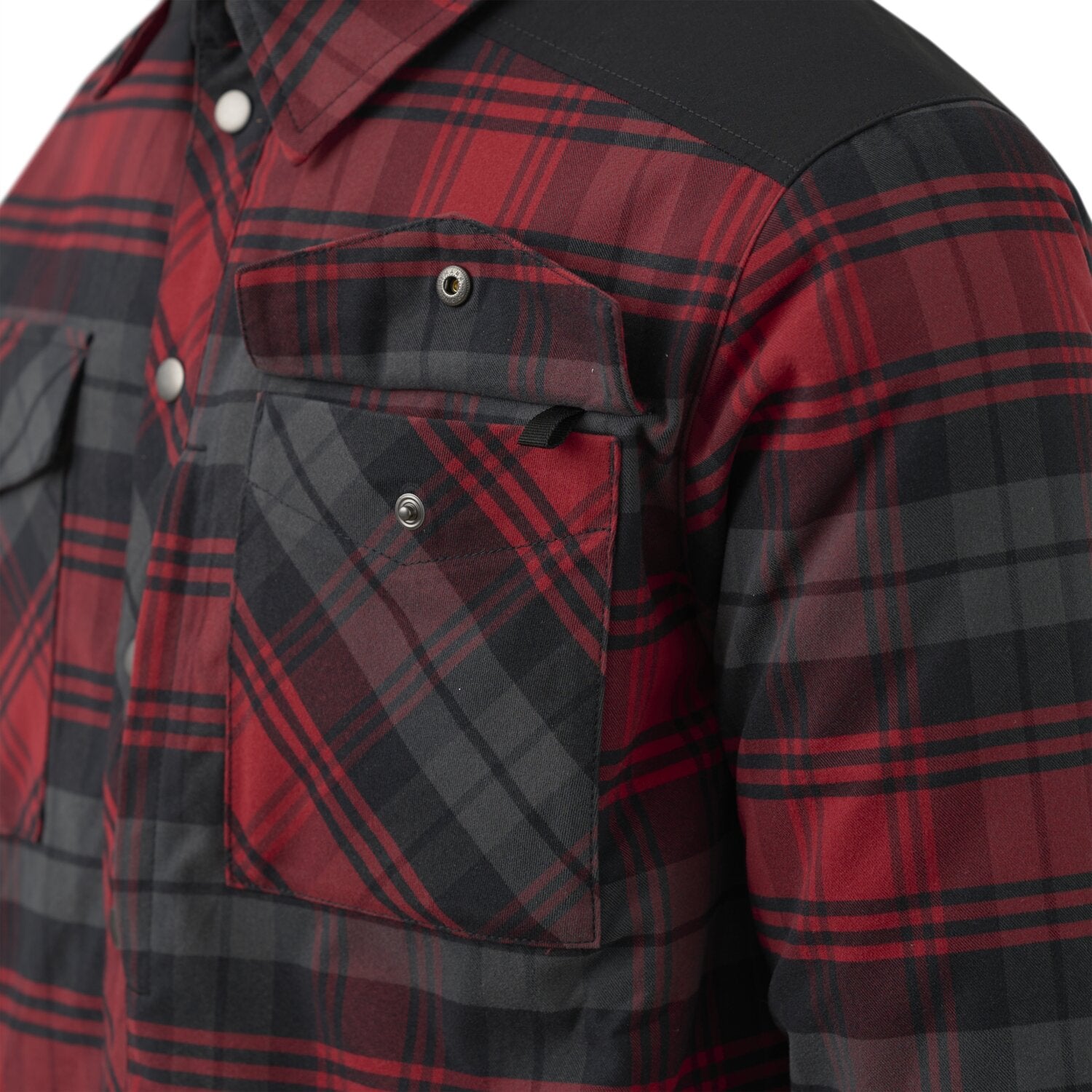 En klassisk ternet skjorte med et twist. Den har hurtigtørrende syntetiske materialer og et let fyld på 60 g/m2, hvilket gør den ideel til situationer, hvor en vinterjakke er for meget, men en windbreaker eller anorak ikke er nok. Skjorten har i alt syv lommer. Indvendigt er der to rummelige lommer til hue og handsker. Udvendigt har den to brystlommer, to håndlommer og en flad lomme til småting. Forstærkede skuldre beskytter skjorten mod slid og fugt. Trykknaplukningen er praktisk og fremhæver skjortens tidløse look.