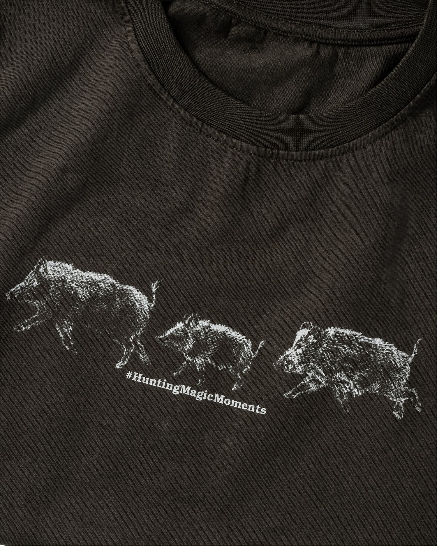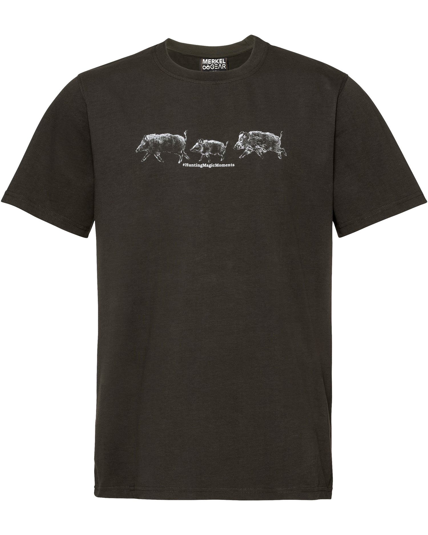 T-shirts fra MerkelGEAR er fremstillet af 100 % bomuld af bedste kvalitet og har en fantastisk materialetykkelse på over 200 g/m², hvilket desværre er blevet usædvanligt i dag. Pasformen er lige. Foran på T-shirten er der et jagtmotiv. På bagsiden af højre skulder er MerkelGEAR-logoet diskret påtrykt. T-shirten er lidt længere bagtil, så den ikke glider op, når du går på vandretur med rygsæk.