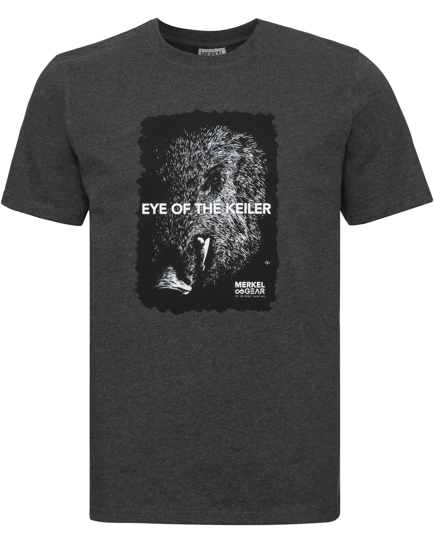 T-shirts fra MerkelGEAR er fremstillet af 100 % bomuld af bedste kvalitet og har en fantastisk materialetykkelse på over 200 g/m², hvilket desværre er blevet usædvanligt i dag. T-shirten er lige så velegnet til jagt som til fritidsbrug. Pasformen er relativt lige og kun let figursyet. Foran på T-shirten er der et stort vildsvin-print. Motivet er tegnet af en Merkel-graver! Derudover er der sloganet "Eye oft the Keiler". På bagsiden af skjorten, på højre skulder, er MerkelGEAR-logoet diskret afbildet. Skjorten er lidt længere bagpå, så den ikke glider ned, når du går på vandretur med rygsæk.