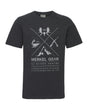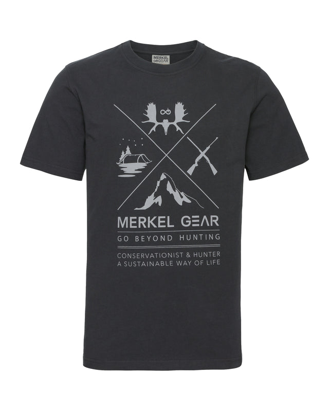 T-shirts fra MerkelGEAR er fremstillet af 100 % bomuld af bedste kvalitet og har en fantastisk materialetykkelse på over 200 gram/m², hvilket desværre er blevet usædvanligt i dag. T-shirten er velegnet til jagt såvel som til fritidsbrug. Pasformen er relativt lige og kun let figursyet. Foran på T-shirten er der et stort lysegråt tryk, der viser et X og forskellige jagtmotiver – herunder en mægtig elg med de typiske MerkelGEAR-horn mellem gevirene. På den bageste højre skulder af T-shirten er hornene desuden diskret afbildet. Bagsiden af T-shirten er lidt længere, så den ikke glider op, når du går på vandretur med rygsæk.