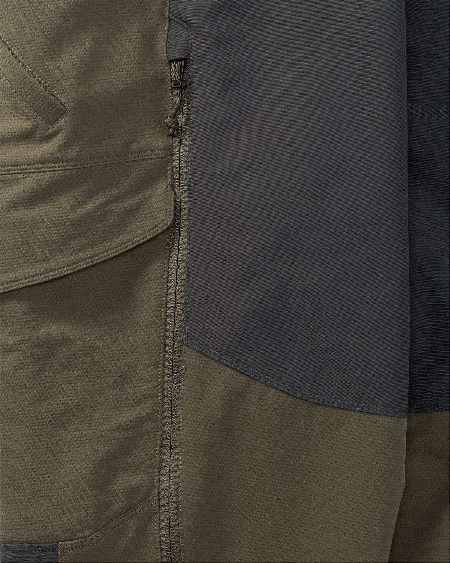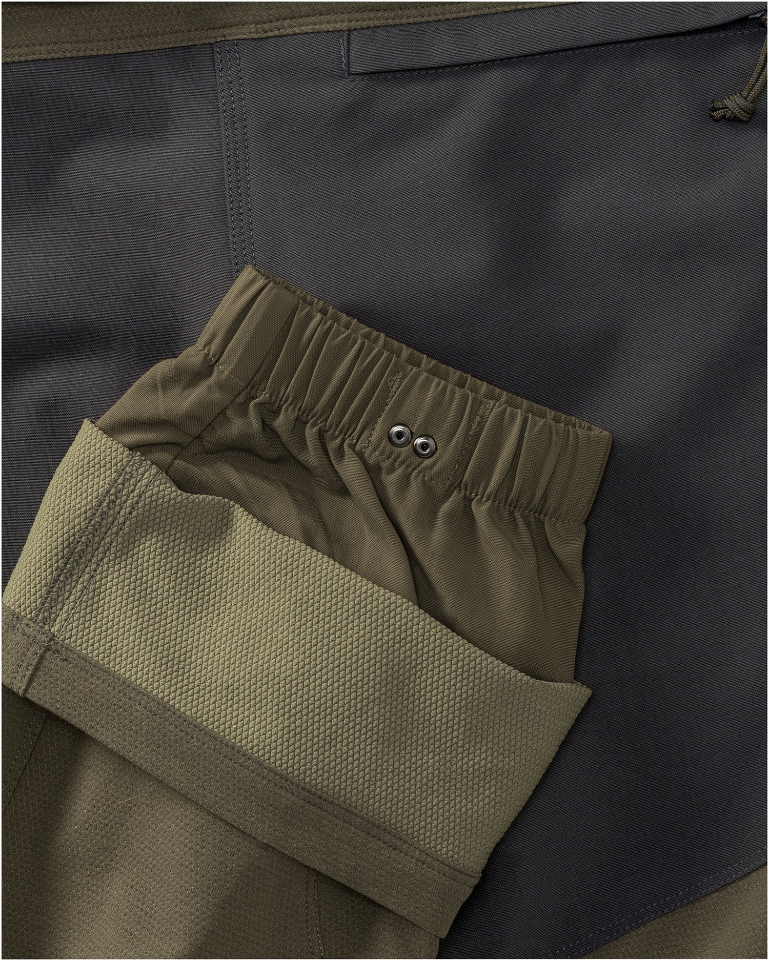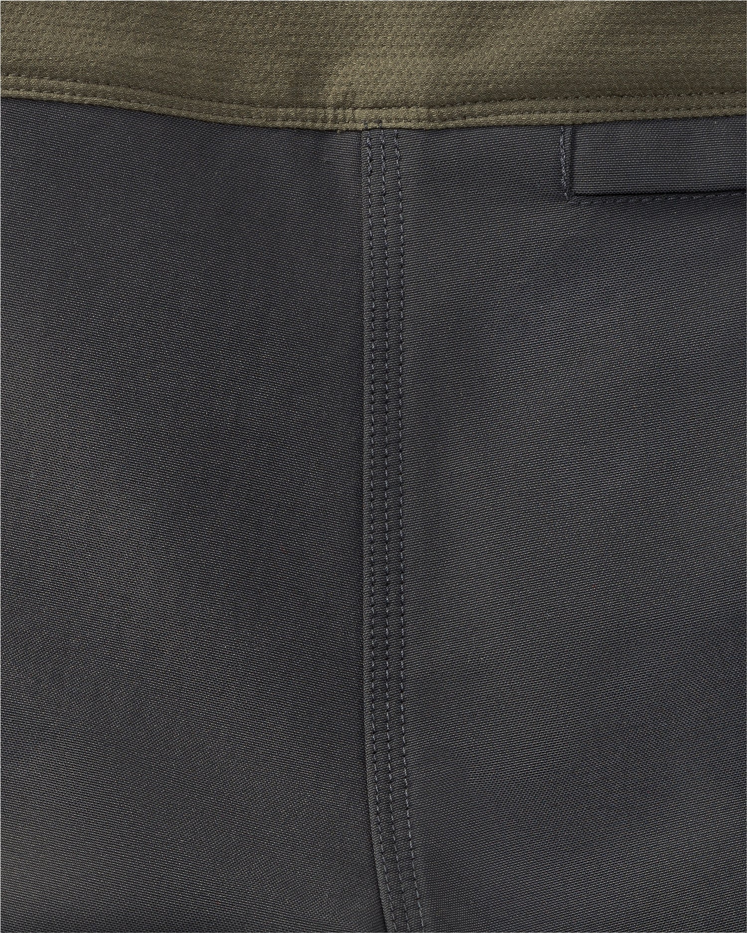 Den tredje generation af Paläarktis MNTN (Mountain) damebukser er på alle måder bedre end sin forgænger: mere funktionelle, endnu mere åndbare og en hel del lettere! MNTN-bukserne fra MERKEL GEAR er helårsbukser til den ambitiøse jægerinde, der jager på glip og i bjergene. Det særligt udviklede, meget åndbare, tværstrækbare og ekstremt robuste Double-Weave Stretch-materiale i kombination med vandtætte, åndbare knæ- og bagpartier af kraftigt, højstyrke Oxford-nylon (37,5™-membran, 20.000 mm / 20.000 g/m²), gør disse bukser til et uovertruffen arbejdstøj, når bevægelsesfrihed er i højsædet. En lang række praktiske detaljer kombineret med det endnu forbedrede MaxComfort-linning-system og et revideret, moderne snit giver en buks, som du garanteret aldrig har haft på, der er mere behagelig! Uanset om du er på natlig vildsvinejagt eller på jagt efter newzealandske thar, finder du næppe en bedre buks til aktive jagtformer. Pasformen er blevet grundlæggende revideret til III. generation: afslappet pasform ved linningen og smallere mod benene, med tredobbelt forformet knæparti, udvendige indvendige sømme i sømområdet (hajfinneform til brug af stegjern) og robuste Oxford-besætninger, der altid forbliver, hvor de hører hjemme. Den nye, innovative "Inside-Seam" cargolommekonstruktion lader regnen løbe af, er mere robust og betydeligt mere elegant end traditionelle påsatte lommer. Magneter og et specielt snit holder lommerne lukkede. Det kraftige stretchmateriale er blevet forbedret yderligere, farven er let justeret, og det er udstyret med en ekstremt højkvalitets DWR-finish mod regn. Den formfuldendte linning har nu 2 løkke-knapper i forskellige størrelser (indvendigt og udvendigt), der garanteret ikke vil løsne sig. Derudover er linningen indvendigt forsynet med en silikonebelægning, der holder din bluse eller skjorte på plads, så bukserne sidder, selvom bæltet eller selerne er blevet glemt. Med integrerede, bløde holder til valgfri seler og store, robuste bæltestropper. Over linningen sidder en velproportioneret lændebeskytter, der omslutter kroppen som en ekstra lag hud. Bukserne har 2 ergonomisk placerede sidelommer (med forbedrede, robuste lommeposer) og en baglomme – alle med lydløse lynlåse. Begge cargolommer er forberedt til den medfølgende patronlap. Den højre cargolomme har desuden en rummelig lomme til solbriller. 44 cm lange (!) ventilationslynlåse i siderne, der går ned til knæhaserne, med selvlåsende semi-automatiske lynlåse fra YKK® sørger for den nødvendige ventilation under svedige ekstreme jagter eller ved bjærgning af vildt og sætter en ny standard for ydeevne på jagtmarkedet. Buksernes benender har tætsiddende, integrerede indvendige gamacher af kraftigt, imprægneret og let stretchmateriale mod sne og flåter. En kraftig skohage, der kan gemmes i en stofflap, når den ikke er i brug, så den f.eks. ikke stikker i gummistøvler, kan fastgøres til bjergstøvlerne for at forhindre bukserne i at "klatre op". III. generation er syet med tætte dobbeltsømme af kraftigt garn, der garanterer lang holdbarhed. En generøs kile i skridtet aflaster skridtsømmene. Vægt ca. 490 g.