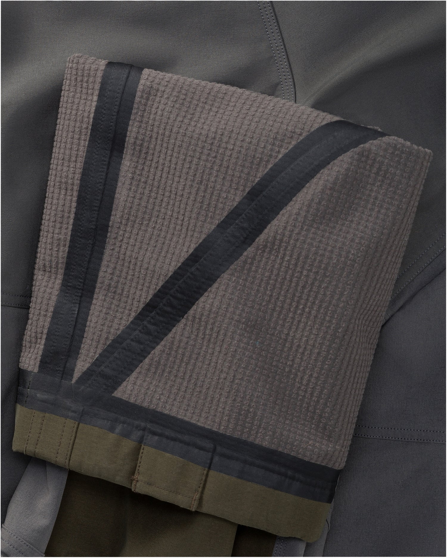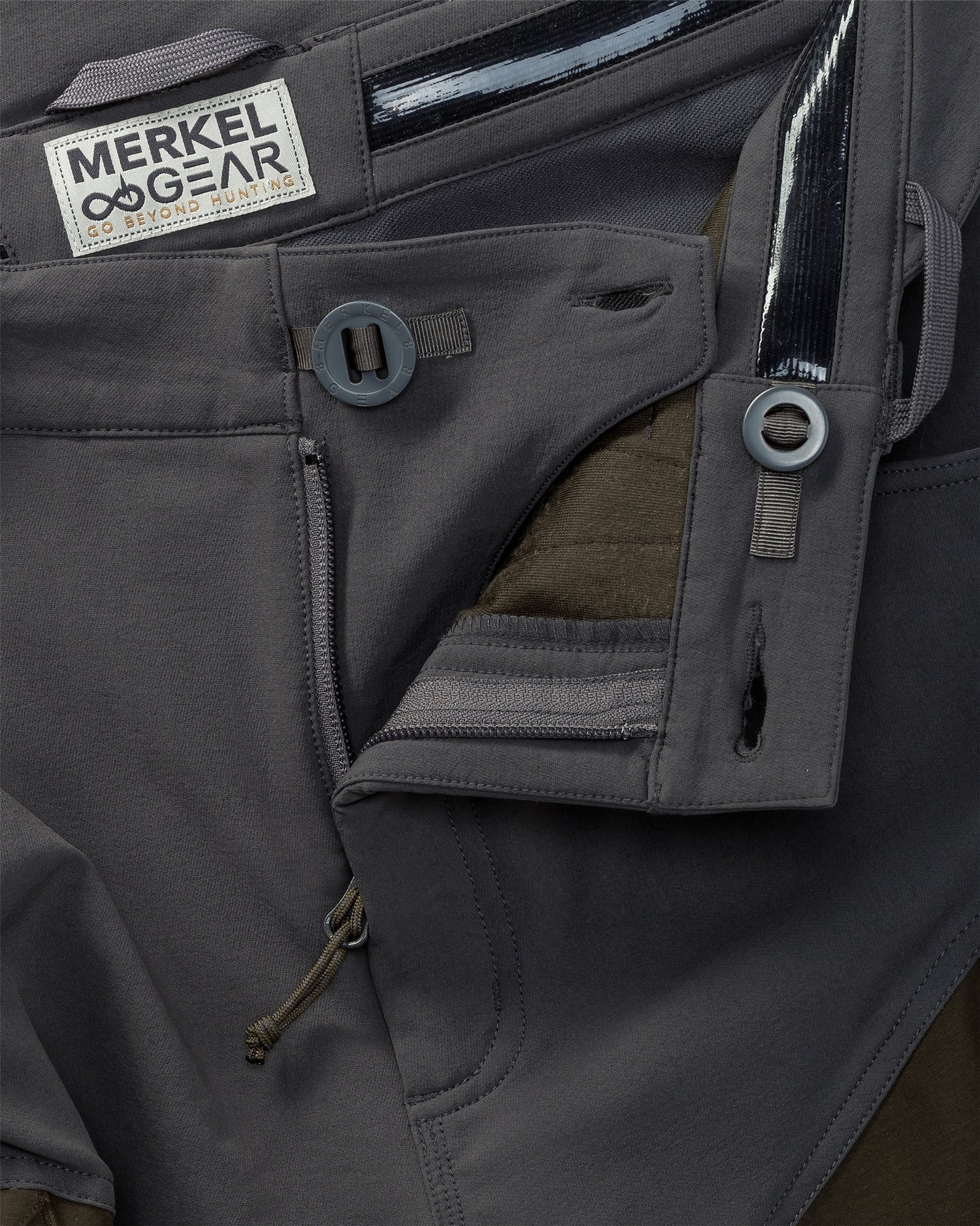 2. generation af Hybrid Alpinist-bukserne fra MERKEL GEAR er designet til aktiv jagt i al slags vejr ved moderate til kolde temperaturer. Pasform, snit og foring er blevet forbedret i den nye generation. Takket være 25 cm lange, kraftige ventilationslynlåse fra YKK® kan "HYBRID Hose" også bruges til sommerjagt og bjergjagt på varme efterårsdage. Det særlige ved disse bukser er den unikke kombination af 100 % vandtætte (termisk forseglede sømme) partier – foran ned over cargolommerne, bagtil ned til lige under knæhaserne og desuden på hele sædepartiet – og kraftige, meget åndbare 4-vejs stretchpartier for maksimal bevægelsesfrihed. Så er du godt beskyttet mod fugt i højt græs, men takket være stretchpartierne kan du præstere i lang tid og dermed holde koncentrationen. I rene hardshell-jakker og bukser sveder man normalt det meste af året på grund af den manglende temperaturforskel til det udendørs miljø. Det er ligegyldigt, hvilken membran der anvendes, da alle membraner har brug for en temperaturforskel på ca. 15 °C for at fungere. Med MERKEL GEAR Hybrid-bukserne kan overskydende varme dog slippe ud i højde med nylonstretch og via de lange ventilationslynlåse. Det 3,5-lags laminat (37,5™-membran, 20.000 mm / 20.000 g/m²/24h), der er indbygget i de vandtætte områder, har en støjsvag, let ru overflade, mens bagsiden er udstyret med fint vaffelfleece, langs hvis struktur overskydende varme ledes væk. Sædepartiet på MERKEL GEAR Hybrid-bukserne er fremstillet af det ultra-kraftige og vandtætte Oxford-foringsmateriale (37.5™-membran, 20.000 mm / 20.000 g/m²), som allerede er kendt fra MNTN- og WNTR-bukserne. De elastiske områder over de vandtætte forstærkninger foran og i knæhaserne består af et meget åndbart, tværstrækbart og meget robust 4-vejs stretch-nylonmateriale. En forbedret DWR-finish lader vandet perle af, og hvis stretchmaterialet alligevel bliver vådt, tørrer det meget hurtigt igen. Hybridbukserne er efter vores mening det ultimative valg, hvis du leder efter en fremragende og meget pålidelig allrounder til jagt i Centraleuropa! En lang række praktiske detaljer kombineret med det endnu forbedrede MaxComfort-linning-system, et moderne snit og nye integrerede sømme på cargolommerne resulterer i bukser, der er uden sidestykke: Forlænget nyrebeskyttelse bagpå, kraftige bæltestropper, stretch-linning med bred silikonebelægning mod glidning. Med integrerede, bløde holder til de valgfri seler. To knapper med løkker foran holder bukserne 100 % på plads. 1 baglomme med lynlås. 2 lommer med dybe lommer i ultrablødt fleece, 2 cargolommer med integrerede sømme (vand kan løbe af + lommen er syet fast i yderstoffet). Den ene med lydløs lynlås og integreret smartphone-lomme, den anden med aftagelig MERKEL GEAR patron-patch. Den højre cargolomme har desuden en rummelig lomme til solbriller. Lydløse, halvautomatiske ventilationslynlåse i størrelse #5. Tredobbelt forformede knæ. Udvendige indvendige sømme i sømområdet (hajfinneform til brug med stegjern). Lydløse justerbare benafslutninger. En kraftig skohage, der kan skjules i en stofflap, når den ikke bruges, så den f.eks. ikke trykker i gummistøvler, kan fastgøres til bjergstøvler. Dette forhindrer buksebenene i at "klatre". Kraftige dobbelte eller tredobbelte kappe-sømme af kraftigt garn garanterer en lang holdbarhed af Paläarktis HYBRID-bukserne. En generøs skridtindsats aflaster skridtsømmene.