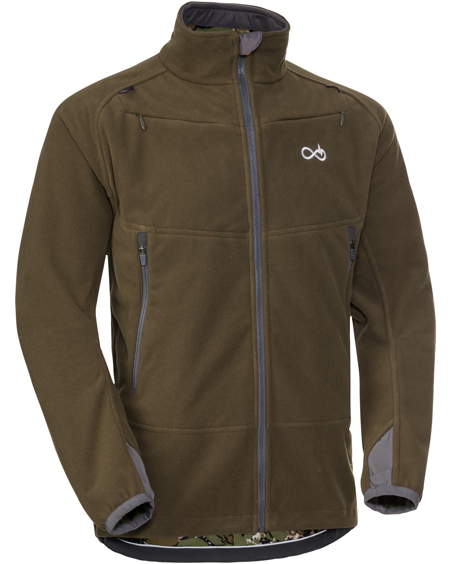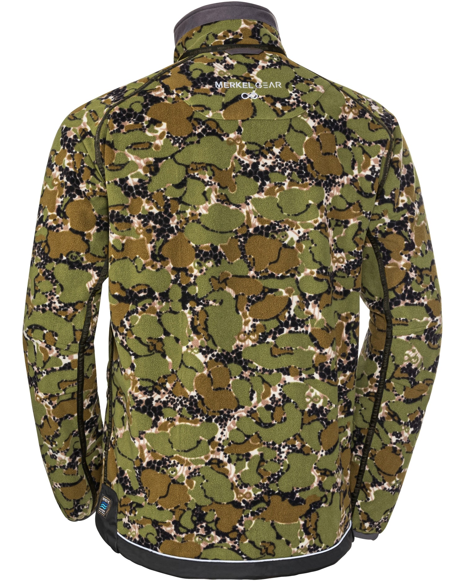 HELIX Infinity Forest vendbar jakke fra MERKEL GEAR er en vindfast fleecejakke med to sider, som passer til nutidens jagtstil. Den over gennemsnitlige fleece-kvalitet og det innovative snit gør HELIX-jakken til et ekstraordinært stykke tøj, der især appellerer til den aktive jæger. Varianten med INFINITY Forest camouflagemønster på den ene side og olivengrøn på den anden side er velegnet til jagt alene. Den anvendte fleece-kvalitet er ca. 30 % kraftigere og dermed betydeligt mere holdbar end normalt, og fleece-stoffets anti-pilling-egenskaber er fremragende. I kombination med den vindtætte og stærkt vandafvisende WND-X-membran resulterer det i en yderst funktionel stofkonstruktion til 365 dage i jagtområdet. Det var vigtigt for hele udviklingsteamet, at jakken var velegnet til rygsæk, hvorfor der blev anvendt raglanærmer, hvis sømme ikke trykker, når jægeren bærer en rygsæk på længere ture. Jakkens snit er moderne og alligevel lige bredt nok til, at man f.eks. kan bære BOREAS-jakken fra G-LOFT® under, hvilket gør denne kombination helt vinterfast! De nederste lommer på jakkerne er placeret lidt højere med ekstra lange YKK®-lynlåse, så man stadig kan bruge lommerne, selv når man har den brede hoftebælte på en rygsæk på. En anden positiv bivirkning er, at vandet perler af albuerne, når hænderne er i lommerne, og ikke løber ned i lommerne, når det regner. Desuden er placeringen af disse Napoleon-lignende lommer meget behagelig. Håndvarmerlommerne har en "mellemvæg" af robust stretchstof, der forhindrer nøgler og spidse patroner i at vandre over i den anden lomme. På hver side er der desuden to brystlommer til hundesporingsudstyr og lignende. Begge lommer kan lukkes med en såkaldt "usynlig YKK-lynlås" og er næsten ikke synlige, når de er lukket. Små stofflapper, der er integreret i raglanærmerne, kan bruges til at fastgøre de lange antenner på GPS-enheder. Jakken har desuden skjulte tommelfingerhuller, en ekstra kraftig elastik i jakkens forneden og en refleks på den bageste søm.
