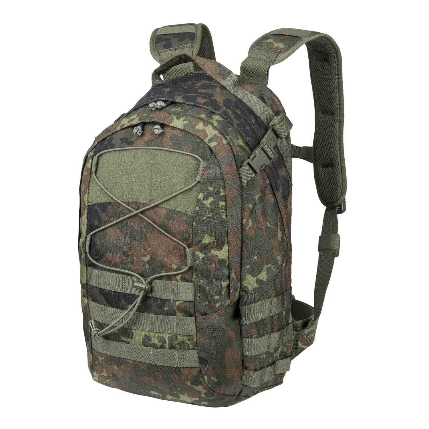 Fronten af rygsækken har et stort krog- og løkkepanel til patches, pins og badges samt en elastisk stødsnor, der gør det nemt at bære en jakke eller sweatshirt uden at optage plads indeni. Derudover har rygsækkens forside og sider tre rækker webbing, der er kompatible med MOLLE/PALS-systemet, så man kan fastgøre lommer, poser eller en førstehjælpskasse til en forretningsrejse eller skoleudflugt. Begge rum i rygsækken lukkes med lynlås, og der er også kompressionsremme på siderne, så man kan justere rygsækkens størrelse alt efter, hvad den skal indeholde. På den måde kan løst