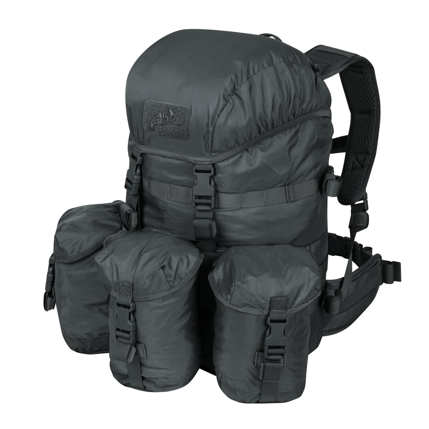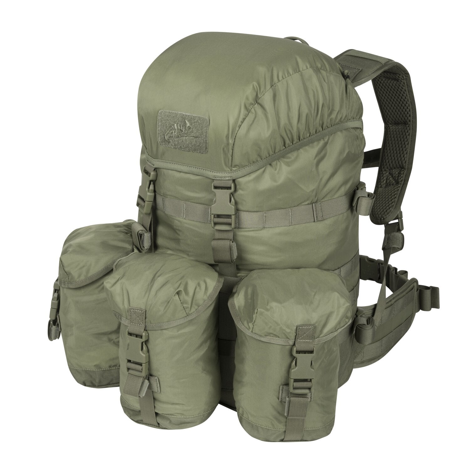 Fronten af Matilda-rygsækken har tre store lommer med gennemgang, f.eks. til en økse, hver med snore og spændelukninger. MOLLE/PALS-kompatible bånd er syet på hovedrummet, så det kan udvides med ekstra lommer, førstehjælpskasser osv. Desuden har rygsækken oprullede stropper i siderne, som gør det nemt at fastgøre en sovepose eller et liggeunderlag. En lynlåslomme på den øverste flap giver nem adgang til små fornødenheder.