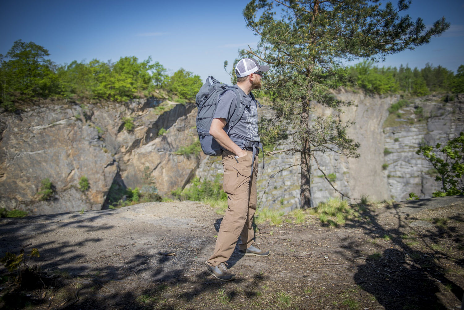 Summit-rygsækken har en aftagelig, elastisk bæverhalelomme foran, som er praktisk til ting som en cykel- eller klatrehjelm, regnjakke eller en ekstra fleece. Rygsækken er udstyret med en rullelukning, men der er også adgang til hovedrummet via en lodret lynlås under bæverhalen. Dette design gør det nemt at hente ting fra bunden uden at fjerne indholdet. Summit har fem lommer til opbevaring: to elastiske sidelommer til en flaske eller termokande og to elastiske lommer med lynlås på begge sider af taljebæltet, så der er nem adgang til de vigtigste ting, snacks eller en telefon. Derudover er der en lille lomme lige bag den øverste lukning. Bagsiden af Summit er dækket af tykt, riflet spacer-mesh, som forbedrer ventilation og komfort under vandreture. Smalle 10 mm MOLLE Lite-strips omkranser rygsækkens bagende og sider og giver mulighed for at fastgøre f.eks. et førstehjælpskit. Der er også kompressionsremme på siderne.