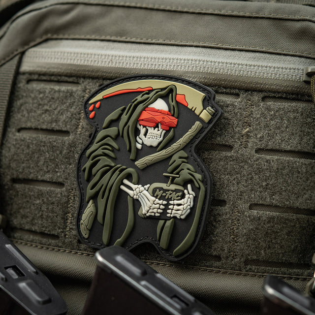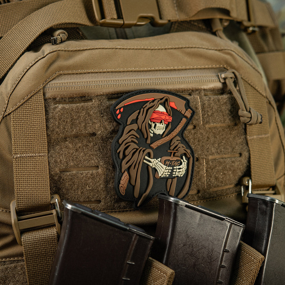 The design features an aged woman with a scythe, a symbol growing weary of long waits. However, skilled FPV operators ensure she never waits for long. With years of wartime experience, they have become adept at orchestrating swift rendezvous with fate.