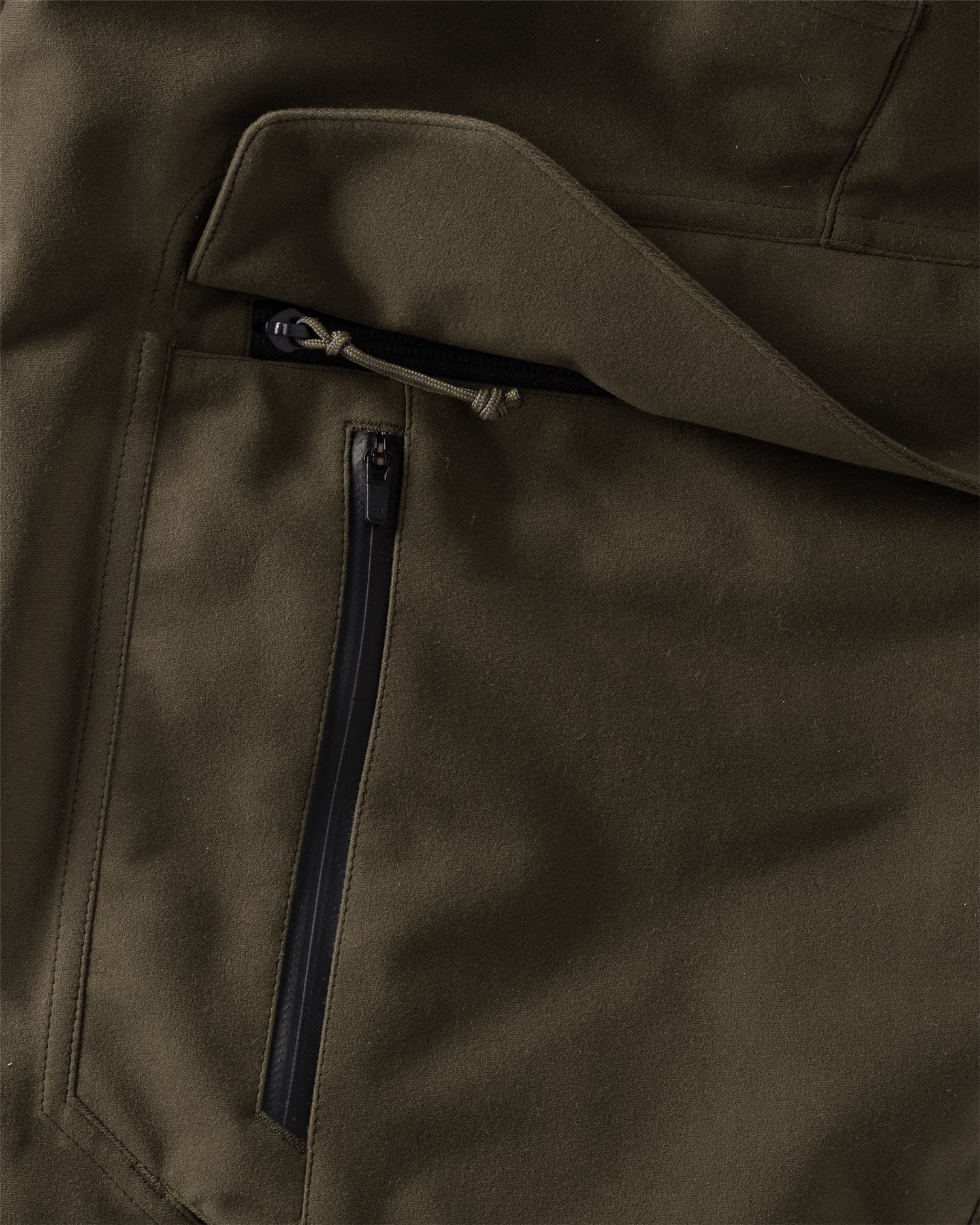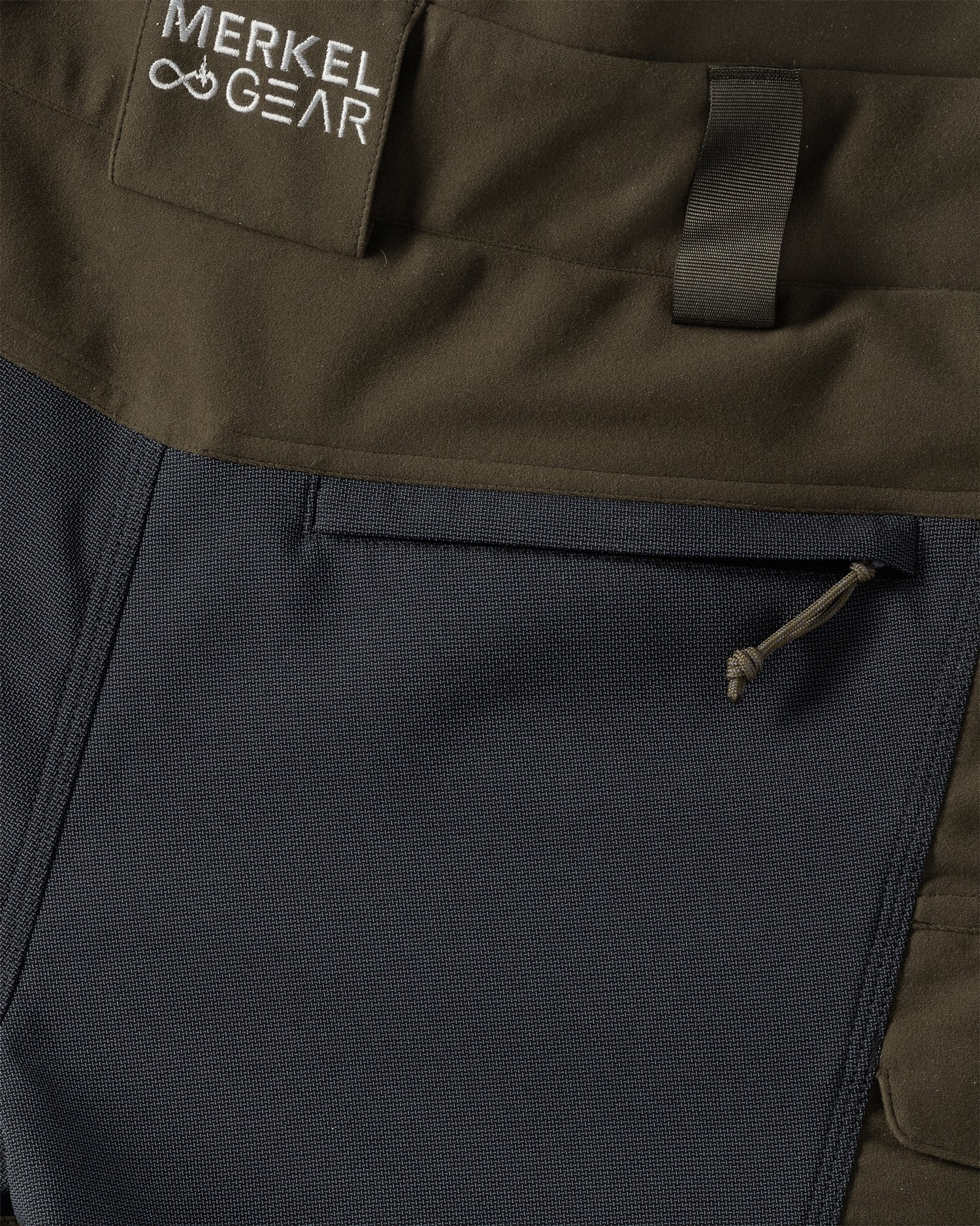 Den gennemprøvede MaxComfort-linning beskytter nyrerne mod afkøling og sidder tæt, men behageligt på kroppen. Ekstra silikonebelægninger og stretchindsatser holder merino-undertøjet på plads og kan klare betydeligt flere lag tøj. Foran på linningen lukkes bukserne med en stor løkke og en meget stabil krogknap fra den tyske producent Gutos®. Bløde løkker på indersiden af linningen kan bruges til at fastgøre MerkelGEAR-seler, der fås som ekstraudstyr. Buksernes bagdel er forstærket med vores gennemprøvede Oxford-nylon. Bukserne har 7 lommer med højkvalitets YKK®-lynlåse, der kan lukkes uden metalliske dele, der rasler, men i stedet med en solid, lydløs snor eller valgfrit en lydløs, halvautomatisk trækker. Expetition Pants har en lynlåslomme bagpå, to håndvarmerlommer i siden med særligt bløde og dybe mikro-fleece-lommer (ingen kradsende trikot!), to meget rummelige cargolommer med en integreret knivlomme. På cargolommerne sidder der hver en sidelomme med lynlås, så du f.eks. nemt kan få fat i afstandsmåleren eller en fløjte, selv når du sidder ned. Knælange lynlåse (2-vejs lynlåse) i yder sømmen sikrer ventilation, når jagten bliver anstrengende. Desuden gør de det lettere at tage tunge støvler på. Expedition G-LOFT® Pants passer perfekt til WNTR EXPEDITION Parka.