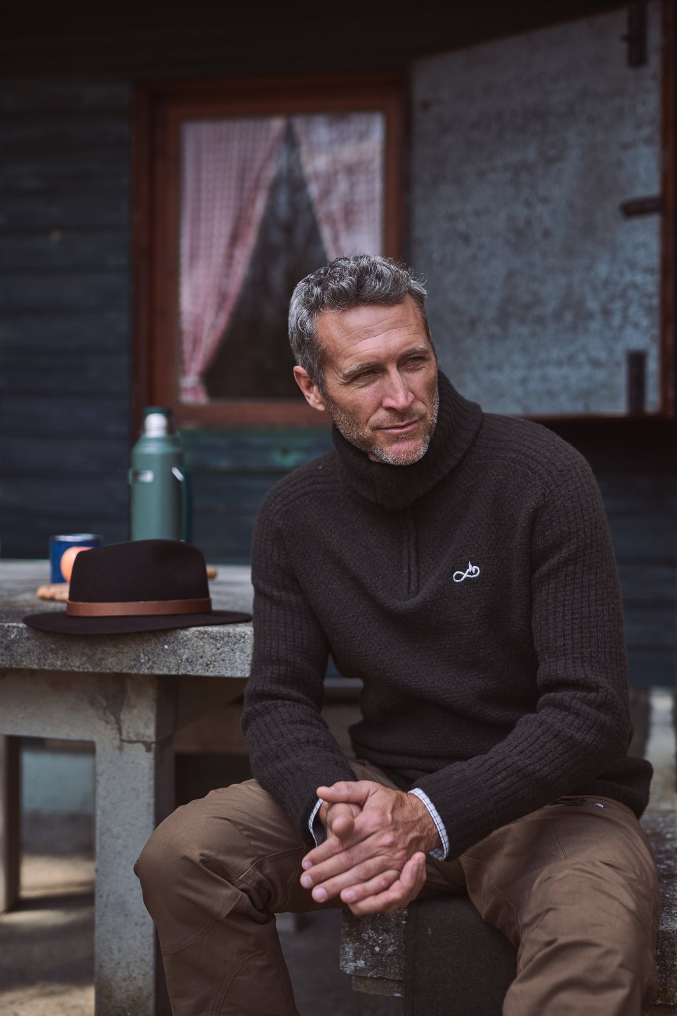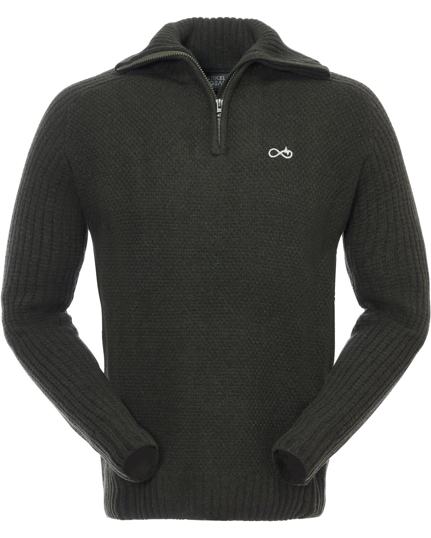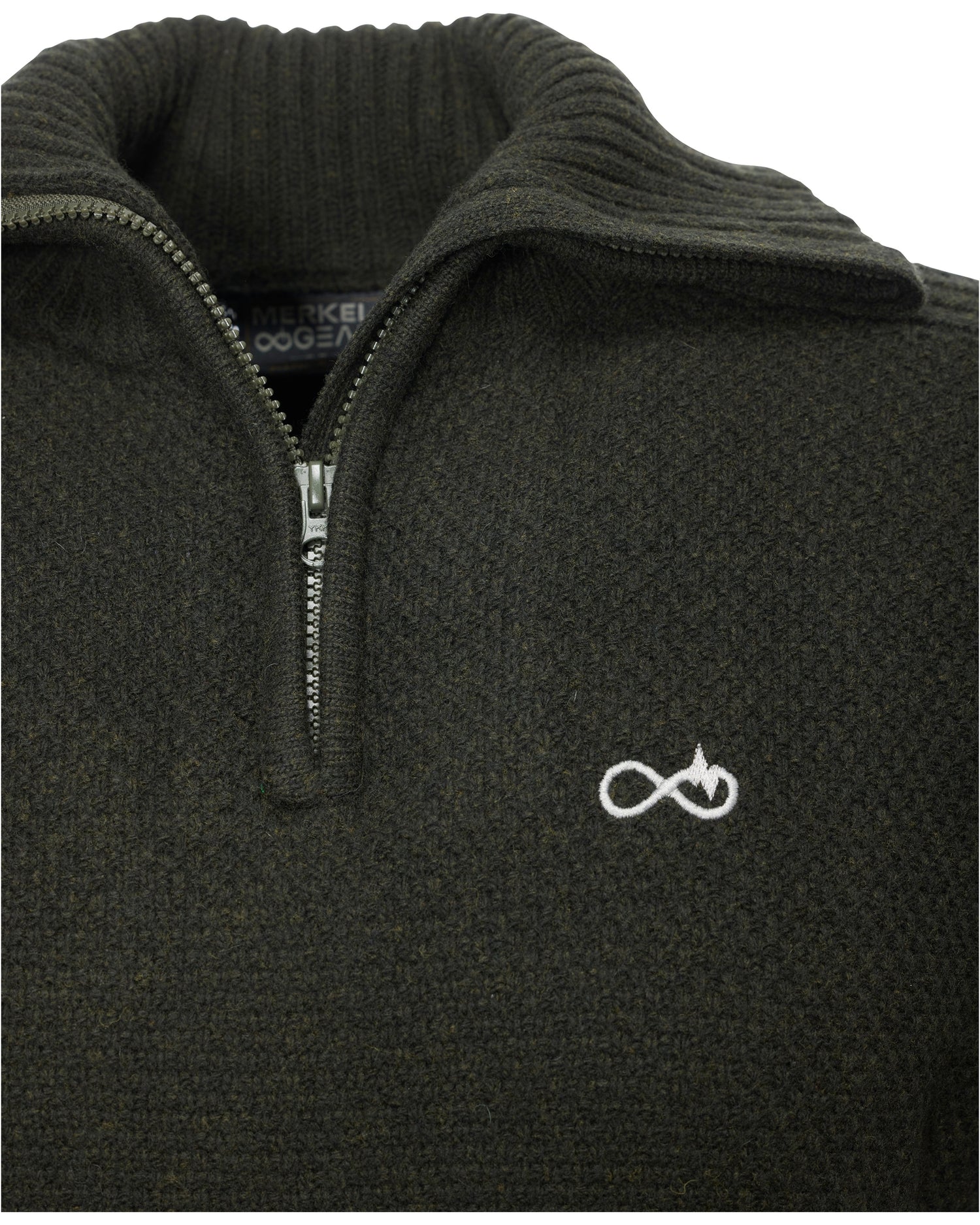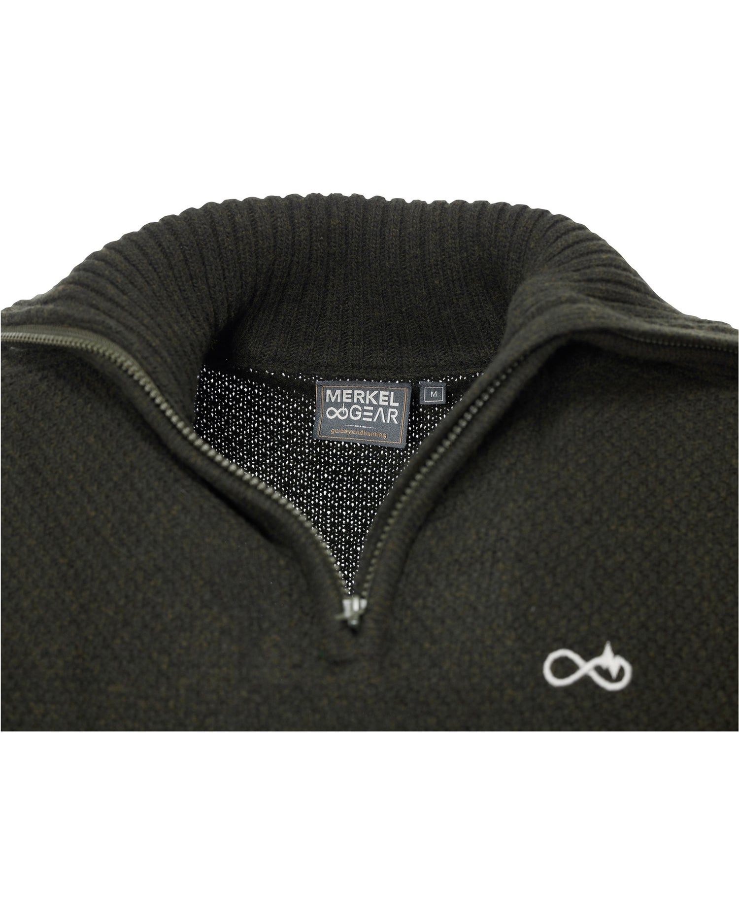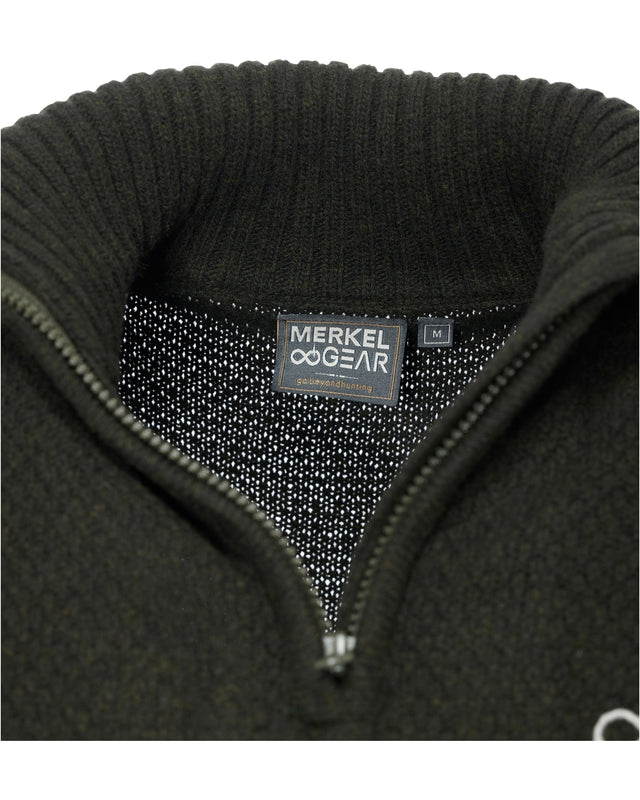 Uldtroyer fra Merkel GEAR er et sandt bolværk mod kolde temperaturer: En blanding af 50 % uld og 50 % polyamid er strikket sammen i tre forskellige strikketyper til en ekstremt varm troyer. Polyamidindholdet holder den klassiske uld-troyer formfast ved vask og forstærker lammeuldfibrene for lang holdbarhed. Den store krave på troyeren kan lukkes helt op med en YKK®-lynlås. Lange ærmer med raglan-skuldre mod trykmærker og velproportionerede, tætsiddende manchetter giver den snigende kulde ingen chance. Merkel-sløjfen er diskret placeret på brystet, ellers er troyeren holdt i en elegant mørkegrøn farve.